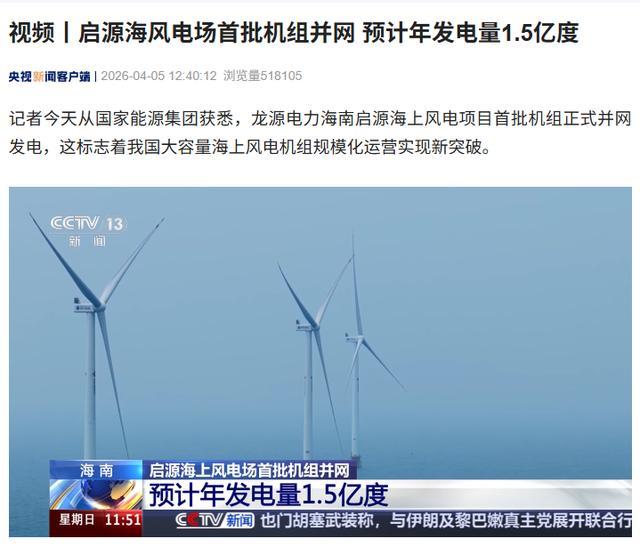 IT之家 4 月 5 日消息,据央视新闻今日报道,记者今天从国家能源集团获悉,龙源电力海南启源海上风电项目首批机组正式并网发电,这标志着我国大容量海上风电机组规模化运营实现新突破。
