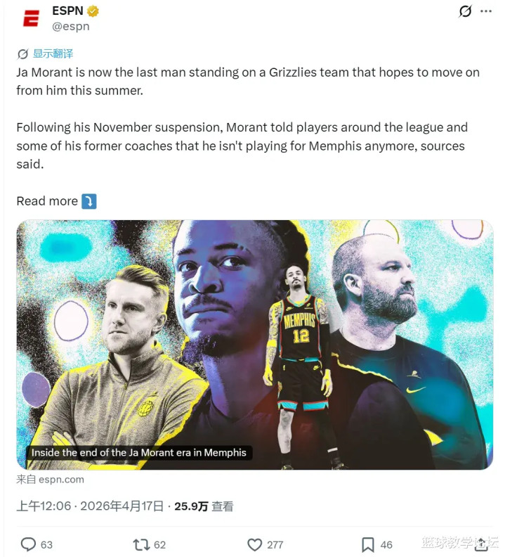 北京时间4月17日,据ESPN记者Tim MacMahon和Michael C. Wright联合报道,莫兰特告诉联盟里的球员们和教练,他不会再为灰熊打球了!莫兰特到现在还未走出赛季初期被灰熊禁赛的阴影,莫兰特感觉自己在灰熊被全队孤立了。