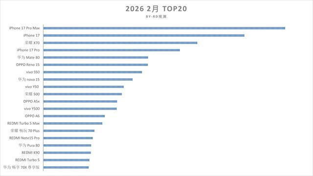 今天分享的是2026年2月国内手机畅销榜TOP20,其中销量最好的依旧是iPhone17Pro Max和iPhone17,两款机型的成绩再次遥遥领先。荣耀X70打败了iPhone17Pro,成为本月最畅销的国产手机,华为Mate80不仅是最畅销的国产旗舰,也是榜单中唯二的过程旗舰,以下是榜单的详细内容。